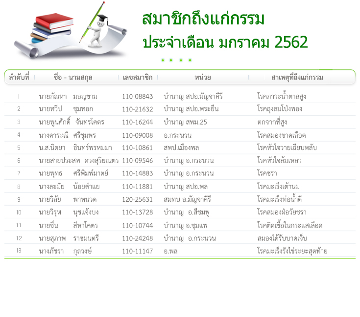 สมาชิกถึงแก่กรรมประจำเดือน กรกฎาคม 2562 สมาชิกถึงแก่กรรมประจำเดือน มิถุนายน 2562 สมาชิกถึงแก่กรรมประจำเดือน พฤษภาคม 2562 สมาชิกถึงแก่กรรมประจำเดือน เมษายน 2562